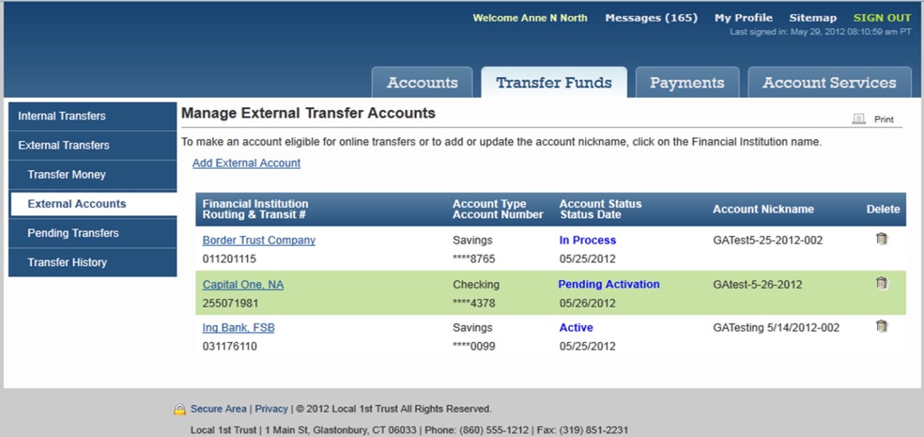 Before an external account (also called an “external transfer account”) can be selected for an external transfer, you must use this function to add, update (if appropriate), validate, and activate the account. To begin this process, click the External Accounts navigation link that displays under External Transfers to request the Manage External Transfer Accounts page illustrated below. This page lists all the external accounts before each account is validated and activated for external transfers.