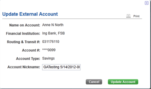 Enter the new Account Nickname and then click Update Account to change this field or click Cancel to cancel this process and return to the Manage External Transfer Accounts page.