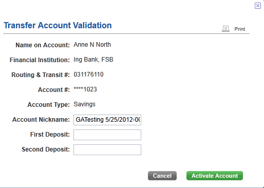 After entering both deposit amounts correctly in the First Deposit and Second Deposit fields, click Activate Account to complete the validation process and make your external account eligible for transfers. The account is then available for selection on the External Transfer account lists. You may also click Cancel to cancel the validation process and return to the Manage External Transfer Accounts page.