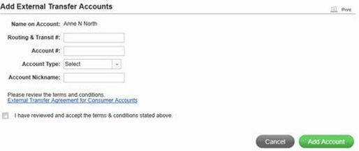 After all of the required information has been provided, you must review and accept the terms and conditions for use of the External Transfers feature. To view these conditions, click the External Transfer Agreement for Consumer Accounts link. To indicate acceptance of the terms and conditions in this agreement, select the I have reviewed and accept the terms and conditions check box. You may then click the Add Account button to add the external account or Cancel to cancel this process and return to the Manage External Transfer Accounts page.